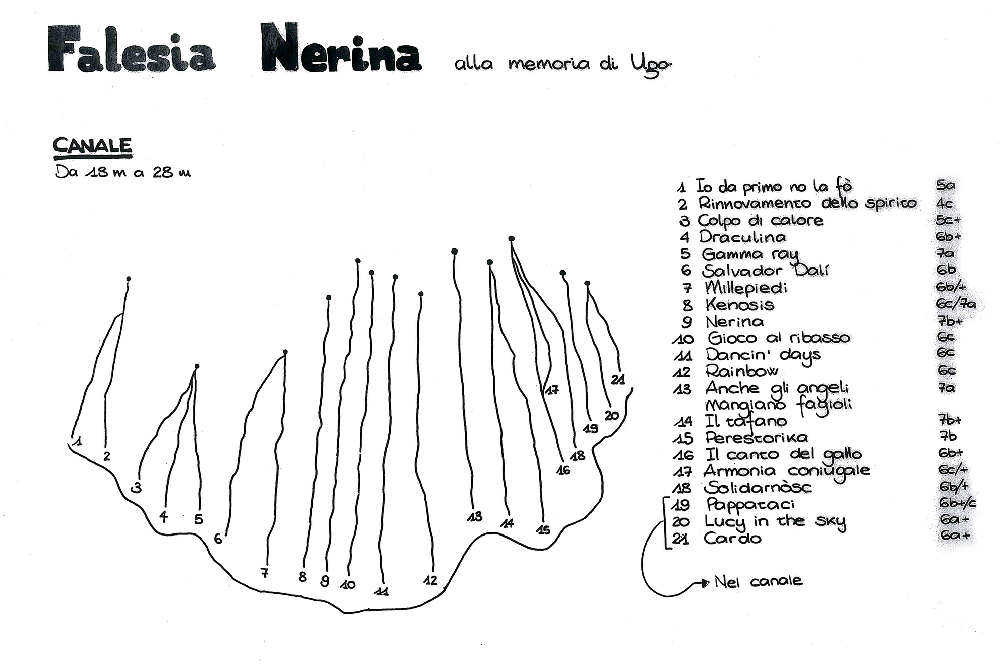 Creata da Giacomo Damiola con l’aiuto dei Graffiti Climbers e il sostegno del Comune di Lozio, la falesia è stata inaugurata il 26 agosto 2017. Posta alle pendici del maestoso massiccio della Concarena, la falesia Nerina prende il nome dal colore scuro dell’eccellente calcare a buchi che la costituisce, ed è dedicata alla memoria di “Ugo”, un compaesano che questa piccola comunità ricorda con affetto.